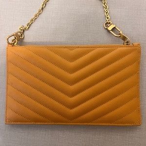 Used once. 100% authentic, bought new from Yoogi’s closet (authenticity guaranteed). Color is dark yellow mustard. It is quite neutral, more on beige side than yellow. This is the zipped pouch (large size) and I added a chain to it that matches the gold color to use as a mini clutch. It can be removed. It fits money, card, a lip stick and key. It wont fit a phone fyi, but super cute for night out.
