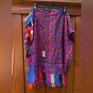 Bright pops of blue, pink, and orange, black, and purple with metallic gold threading throughout