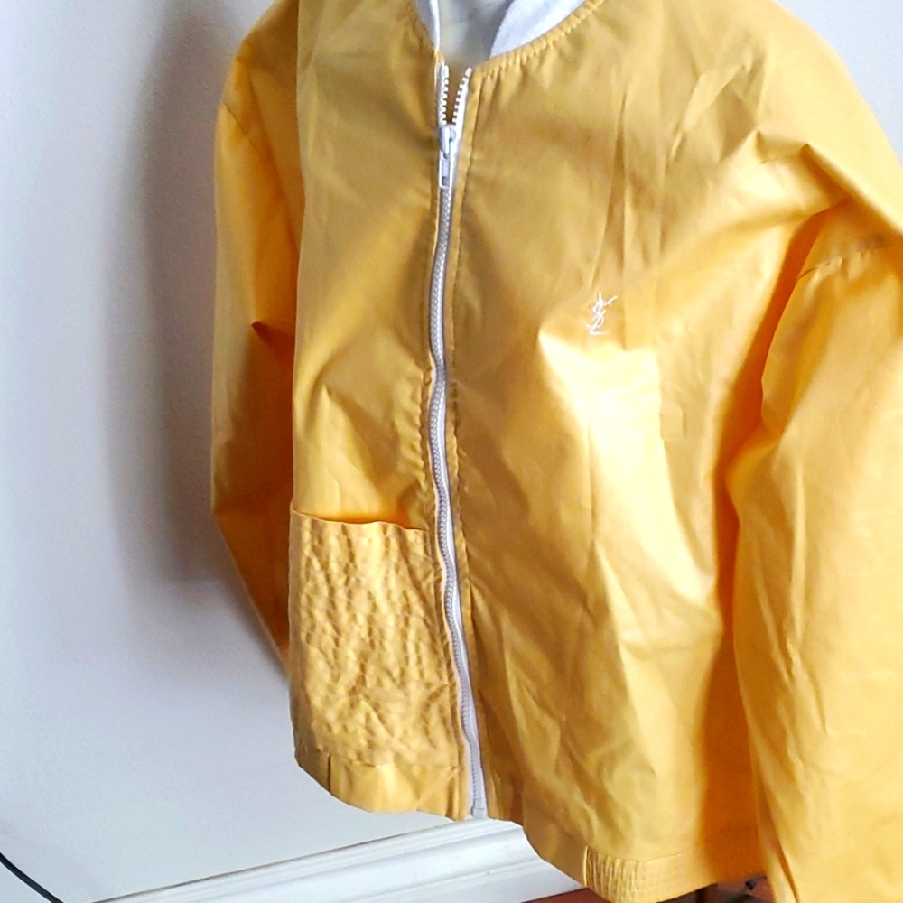 YSL old school golf style zip up. yellow with white accents. side/ front zipper pocket. elastic waistband. accented pockt, and wristband. see measurements. fits me I'm 4 loose. also my kid- wears 6