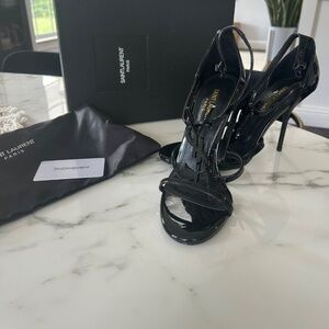 Black YSL strappy heels, never worn, cover bag, box and authenticity card included