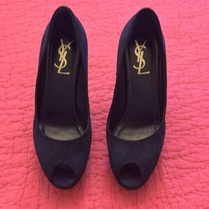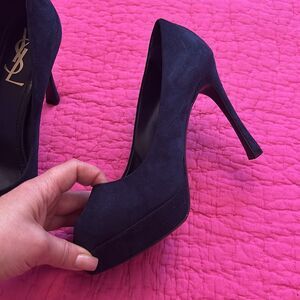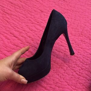 Step out in style with these elegant navy blue peep-toe heels. Perfect for any occasion, these shoes offer both comfort and sophistication. Genuine suede, excellent condition, signs of wear only on soles, excellent condition, no box