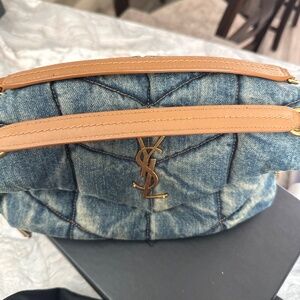 YSL denim puffer bag, brown strap with gold chains. Perfect look with denim outfit.