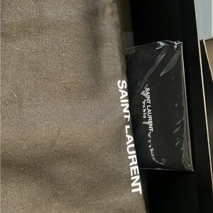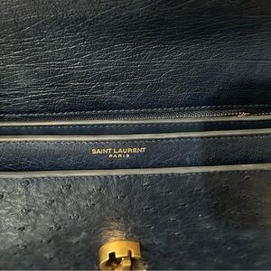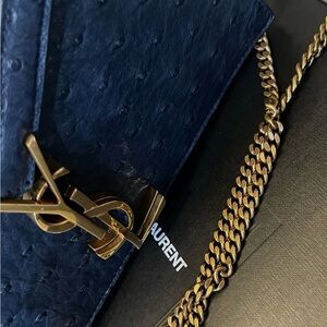Features a rare navy colorway with natural quill follicles, polished gold hardware, and the iconic YSL monogram closure.