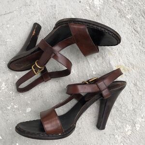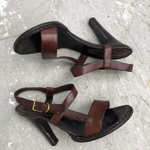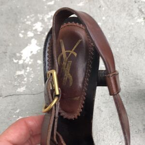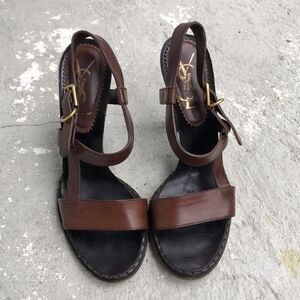 Super cute YSL heeled sandals. They are in good condition, but not perfect. Please look at the pictures. I will touch up the back of the heel with polish before shipping out. Heel height is almost 4 inches. Color is like a chocolate brown. Made in Italy.