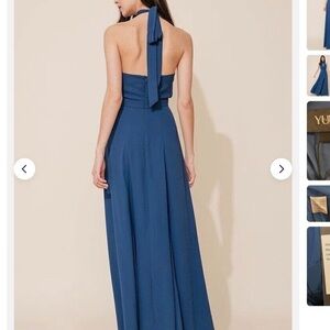 Brand new Yumi Kim High Demand Maxi Gown in Ink Blue. The front keyhole and thigh-high slit lend a sultry flair to this gown. High halterneck. Sleeveless. Concealed zipper back. Back tie closure. Ruched. Banded waist. Open back. Lined. Last photo to show fit.