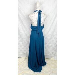 Blue poly chiffon (100% Polyester). Gown. Sleeveless. Halter neckline. Hidden back zipper with hook-and-eye closure. Fully lined.
