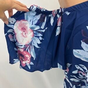 This YUMI KIM Celine dress in navy blue features a beautiful floral pattern and off-the-shoulder sleeves, making it perfect for a party or casual occasion. The dress is made of 100% polyester chiffon and has a zip closure.