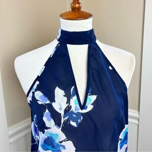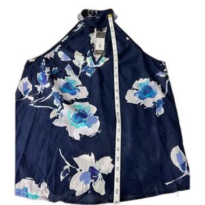 New with tags and ready to charm your wardrobe like a romantic comedy montage. This high-neck halter blouse features a dramatic keyhole neckline, stunning blue floral print, and the kind of swooshy rayon-viscose blend that says, “I don’t sweat—I shimmer.”