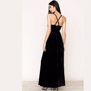 The black velvet dress includes a crossover bodice with deep v-neckline, snap chest closure, self-tie waist,& cross-back