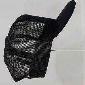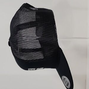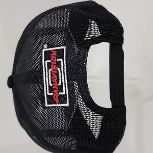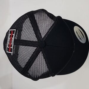 Black hat with white and red embroidered front. Cotton crown and bill, mesh and snapback.