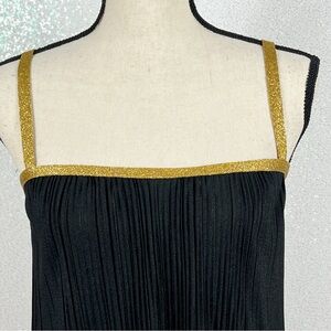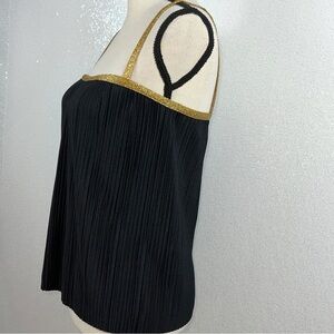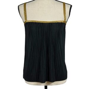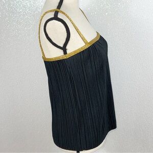 Vintage YVES SAINT LAURENT pleated camisole top. It has a sparkling gold trim around the top and straps. This camisole is easy to wear and style with mini knife pleated details. Simply unique one of a kind piece to add to your wardrobe! There is no size on label, it measures close to a small/ medium. In order to determine the best fit, measurements are listed , measure yourself to insure proper fit.