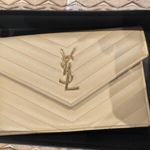 YVES SAINT LAURENT's 'Cassandre' nude clutch handbag has been made in Italy from matelassé textured-leather and punctuated with the brand's iconic 'YSL' plaque. It's fitted with a zipped compartment and 20 card slots. Attach the chain strap to carry it as a crossbody. It can also be worn as a wristlet. As with all of my listings, this item is 100% guaranteed authentic. It retails for over $1600.