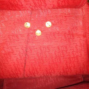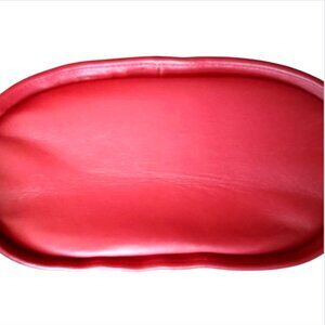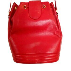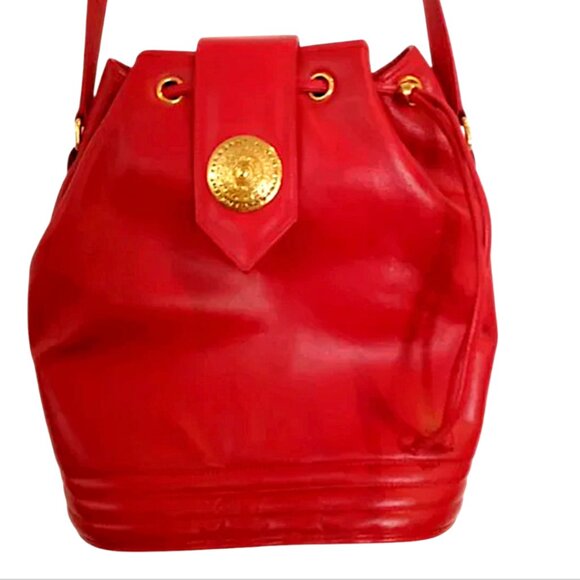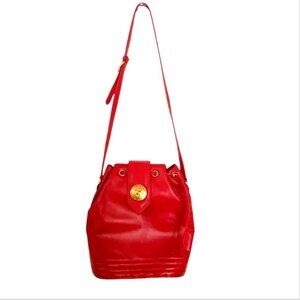 Smooth bold red leather bag, designed with a structured bucket shape bottom half, and unstructured, soft top half to allow for drawstring to snug closed the top, then a strap with gorgeous medallion closes over the drawstring.