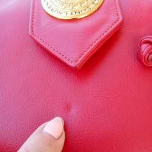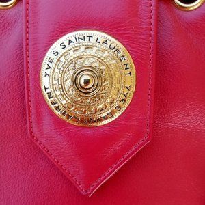 The magnetic tab closure has a large gold tone Aztec-style medallion with the Yves Saint Laurent name.