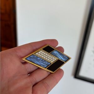Stunning YSL designer diamond-shaped brooch featuring blue and black enamel with sparkling crystals.