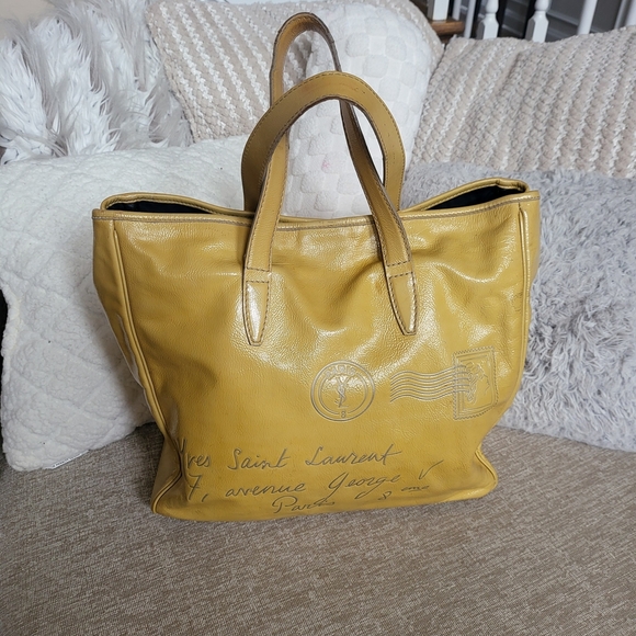 Clean condition, Elegant yellow tote by Yves Saint Laurent. Features signature design elements. Ideal for everyday use. some stains on handles underneath, and couple stains on bottom...due to normal wear,, (can be clean), Interior very clean and hardware good shape, zipper works good, stamp and code on pictures..great bag for any day use.