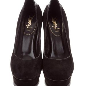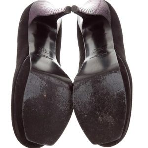 Black suede Yves Saint Laurent Tribute Two platform pumps with round toes, tonal stitching and purple ostrich leg counters and heels. Includes box and additional heel taps. Unfortunately, due to restrictions, this item cannot be shipped internationally.