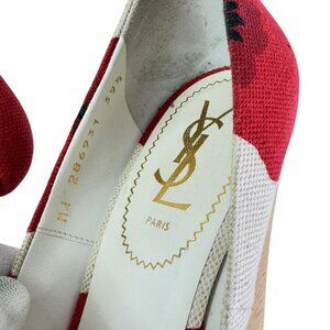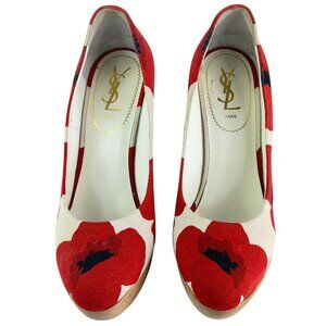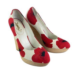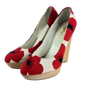 YVES SAINT LAURENT Red & Beige Fabric Poppy Print Platform Wedges 39.5 - 9.5US