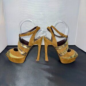 YSL's almost vintage snakeskin and suede peep-toe sandal with wrap around ankle straps. Very rare, i cannot find another pair or any information on them. Purchased from Neiman Marcus about 12/13 years ago... packed them for a move and they ended up in the wrong box and went off to storage. With the new warmer tones taking center stage for the next couple of seasons, these beauties can literally be worn for the entire year and then some!