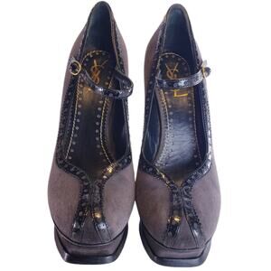 YVES SAINT LAURENT TRIBUTE MARY JANE PLATFORM PUMPS IN GRAY PATENT TRIM SIZE 8.5