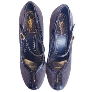 THESE GORGEOUS DESIGNER SUEDE & LEATHER MARY JANES ARE A TRUE CLASSIC. PAIR THEM WITH A SEXY LBD, JEANS AND A T-SHIRT OR EVEN A SLEEK BUSINESS SUIT. THE PLATFORM CREATES A UNIQUE PROFILE AND A TREMENDOUS AMOUNT OF COMFORT FOR SUCH A HIGH HEEL. PLEASE PAY ATTENTION TO THE WEAR ON THESE CLASSIC YSL PUMPS, REFER TO THE PICTURES PROVIDED.