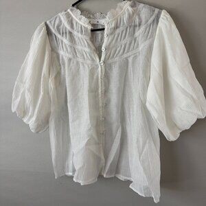 Elevate your look with this delicate sheer blouse from YY, featuring a classic button-down front and breezy short sleeves. Perfect for layering over tanks or camisoles, this blouse adds a light, airy touch to any outfit. Gently worn and well cared for, it’s a versatile piece that pairs beautifully with skirts, trousers, or jeans for both casual and dressy occasions.