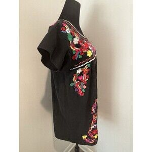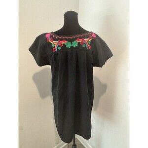 YZXDORWJ Black Multi-Colored Embroidery Mexican Boho Short Peasant Dress Small