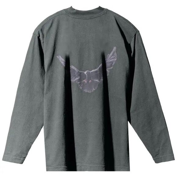 yeezy gap, yzy dove, kanye west, oversized tee, long sleeve shirt, dark green top, streetwear style, hype clothing, unisex fashion, dove graphic back, rare yeezy drop, winter streetwear, collectible collab, size large
