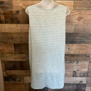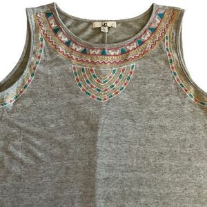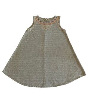 Midi Tee Shirt Dress by YA Los Angeles with Round Neck Sleeveless Grey Body with Geometric Embroidery in Yellow White Pink and Turquoise at Neckline Women’s Size Large
