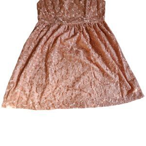 Brand: Ya Los Angeles. Occasion: Party, Cocktail, Formal, Special Occasion, Prom, Homecoming. Size Type: Regular. Size (Women's): L. Material: Self: 100% Polyester, Lining: 100% Polyester. Neckline: Scoop Neck. Style: Fit & Flare, Skater, Mini, Embroidered, Floral. Sleeve Length: Sleeveless. Color: Pink, Blush, Rose Gold (due to metallic thread). Pattern: Floral, Embroidered. Features: Mesh overlay with floral embroidery, Zipper closure on back, Hook and eye closure, Fully lined, Metallic thread accents in embroidery.