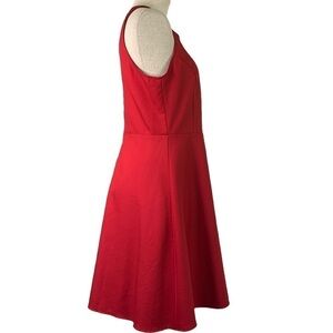 Striking fit & flare sleeveless red dress with silver rectangular sequin embellished yoke around neck and bust. Deep but modest v-neck. Full zip in back.