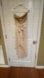 Elegant strapless dress with gold sequin bodice and cream flowing skirt. Perfect for special occasions.