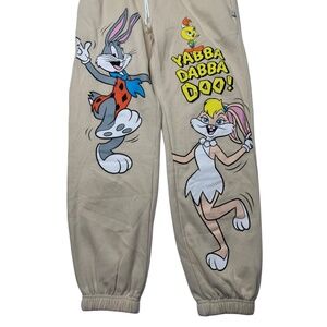 Step into comfort and nostalgia with these brand new Warner Bros. Double-Sided Sweatpants Joggers, featuring iconic characters from Yabba Dabba Doo! and Space Jam. Showcasing beloved favorites—Bugs Bunny, Lola Bunny, and Tweety Bird—these joggers are a playful yet stylish addition to your wardrobe.