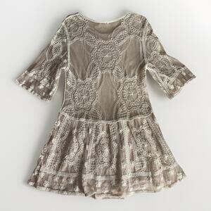 Beautiful Yaira lace dress/tunic in size XL. Features an elegant sheer beige mesh base with intricate cream crochet lace overlay, floral design, and flared drop-waist hem. 3/4 sleeves and lightweight construction make this piece perfect for layering, festivals, or boho-inspired outfits.