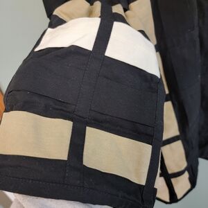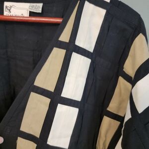 Stylish open cardigan with a geometric pattern. Features black and tan colors. Perfect for layering.