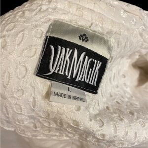 This 100% cotton Yak Magic jacket is a beautiful and a rare find. It is a size large and features two front buttons, two front pockets, lace trim on the collar, and lots of elaborate details. The eyelet jacket is in a beautiful white color and is perfect for the spring and summer seasons. The measurements of the jacket are approximately 21 inches pit to pit, 23 inches long, and 17 inches shoulder to shoulder. Don’t miss out on this stunning and unique piece to add to your wardrobe! It is in perfect vintage conditions (pre-owned)