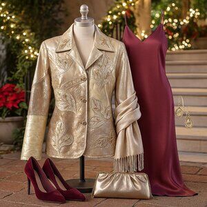 Style with a burgundy satin dress & gold accessories for festive holiday evenings