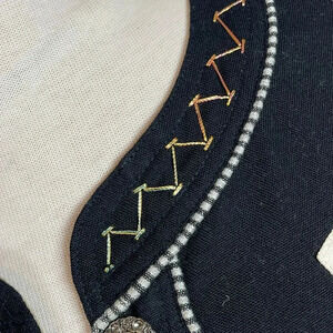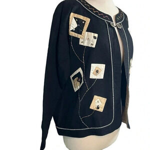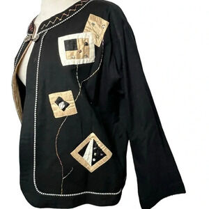 Yak Magik Wearable Art, fun, funky embellished jacket, made of cotton and silk in Nepal, unique patches, beading, and stitching, open front with a hook button closure at neckline, vintage, women's size large.