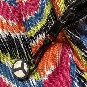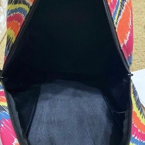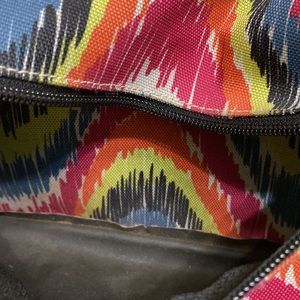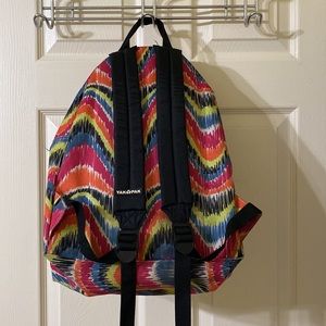 Multicolor yak pak backpack. Has adjustable straps and one big pocket and a front pocket. A couple stains on the back and the bottom but in good shape other than that.