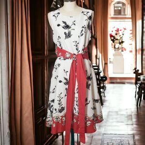 Yaly Couture Romantic Tomato Girl Floral Sleeveless Linen Midi Dress with Sash