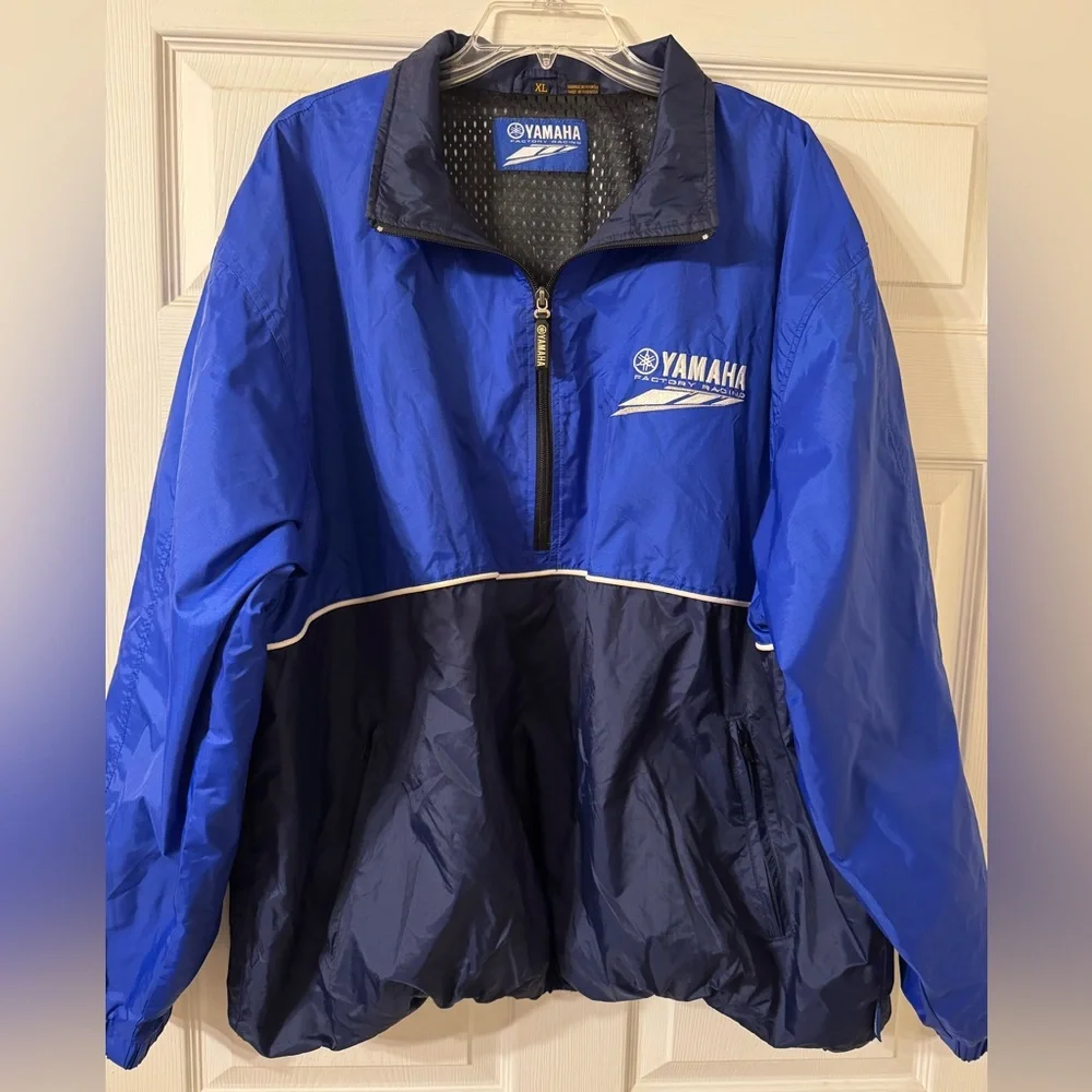 Bold blue Yamaha jacket with logo embroidery. Perfect for racing enthusiasts.