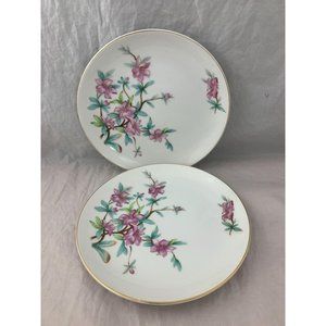 Vintage Yamaka China pair of Salad Plates. The plates are 7 5/8" across. These are pattern B2594 which has pink flowers with blue and green leaves. Made in Occupied Japan which dates the pieces to between 1945 and 1951. Yamaka China was established in 1913 in Toki Gifu Prefecture.