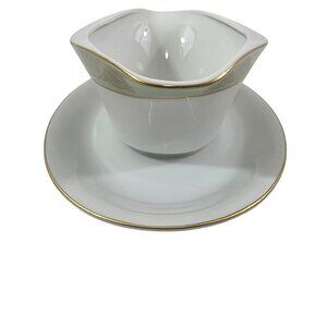 Gravy Boat is White with A Green Boarder and Gold Accent