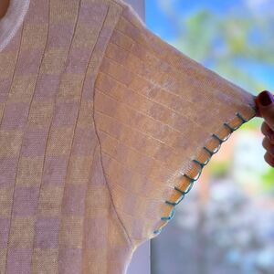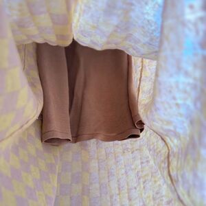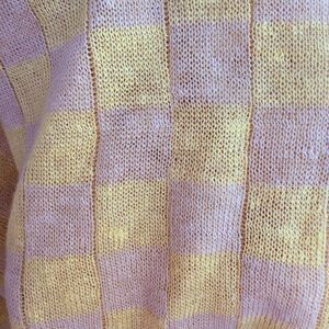 Off-white / cream knit round neck, with butter yellow and beige/tan checkered knit throughout