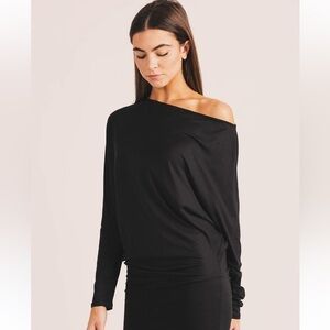 Hip measures approximately 14” flat lay unstretched. Arm pit to arm pit is difficult to measure as there is no clearly defined arm pit with the dress’ dolman sleeve style.