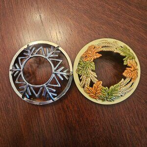 Set of 2 Yankee jar candle toppers, one is a snowflake and one fall leaves.