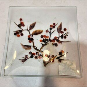 The Yankee Candle Berry Crackle Candle Tray is a small square glass candle holder suitable for pillar candles. The multicolor design in red, orange, and brown adds a festive touch to any room, perfect for the seasonal theme of fall or winter. With its rustic/primitive style and decorative features, this candle tray is a charming addition to any home decor. Easy to clean with a damp cloth, this free-standing tray is a stylish and functional piece for your candles and home fragrance collection. Open box. Never used. New. Please see pictures for details.