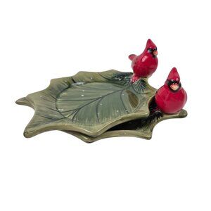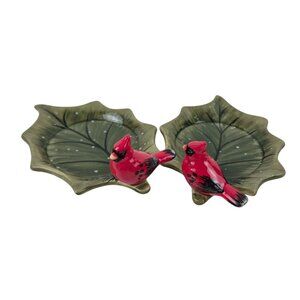 Elegant ceramic dishes featuring a cardinal and leaf design. Perfect for holiday decor or as a thoughtful gift. Enhance your table setting with this vibrant red bird and green tray combination.