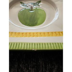 This is a pentagon-shaped ceramic plate featuring a hand-painted green apple design. It has a decorative yellow and green border, adding a vibrant touch to the piece.
