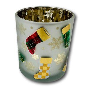 As the holidays draw near, deck the halls with a classic accent. This frosted glass holder features colorful holiday stockings that flicker and glow with the light of your favorite festive Votive or Scented Tea Light Candle.